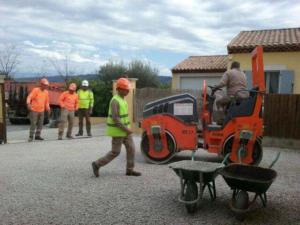 Sensibilisés à l'évolution de Guillaume et de sa perte d'autonomie. Sensibilisés aux difficultés que nous rencontrions avec les fauteuils roulants manuels et électriques dans les graviers pour sortir de la maison, toute l'équipe de Célim de l'Entreprise COLAS sont venus poser l'enrobé à chaud sur le devant de notre maison.